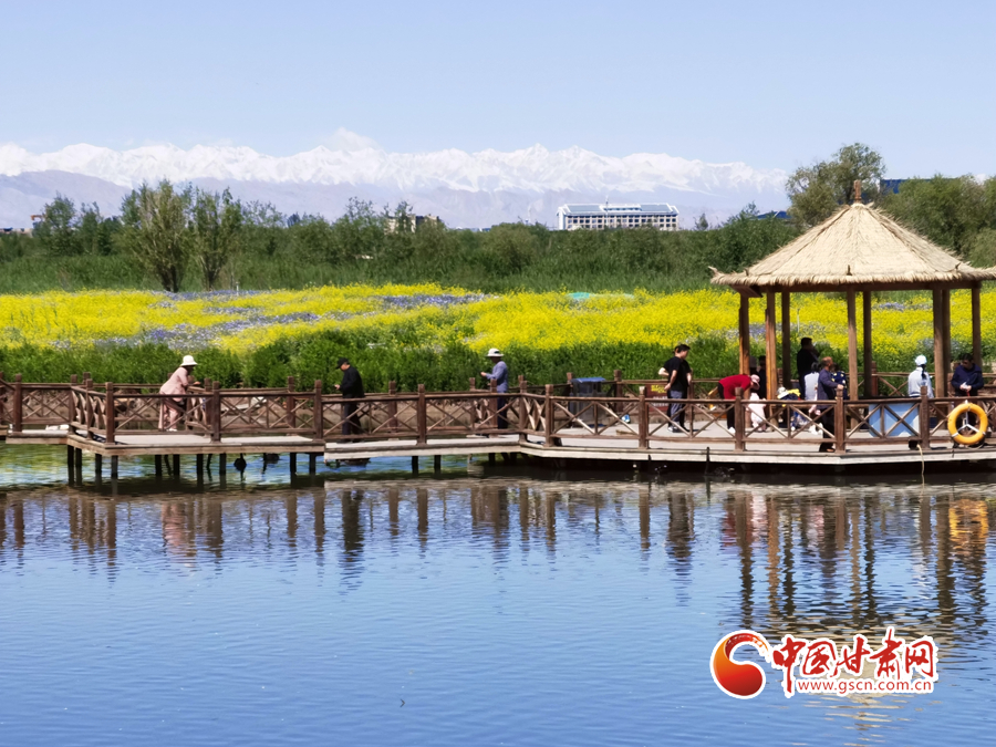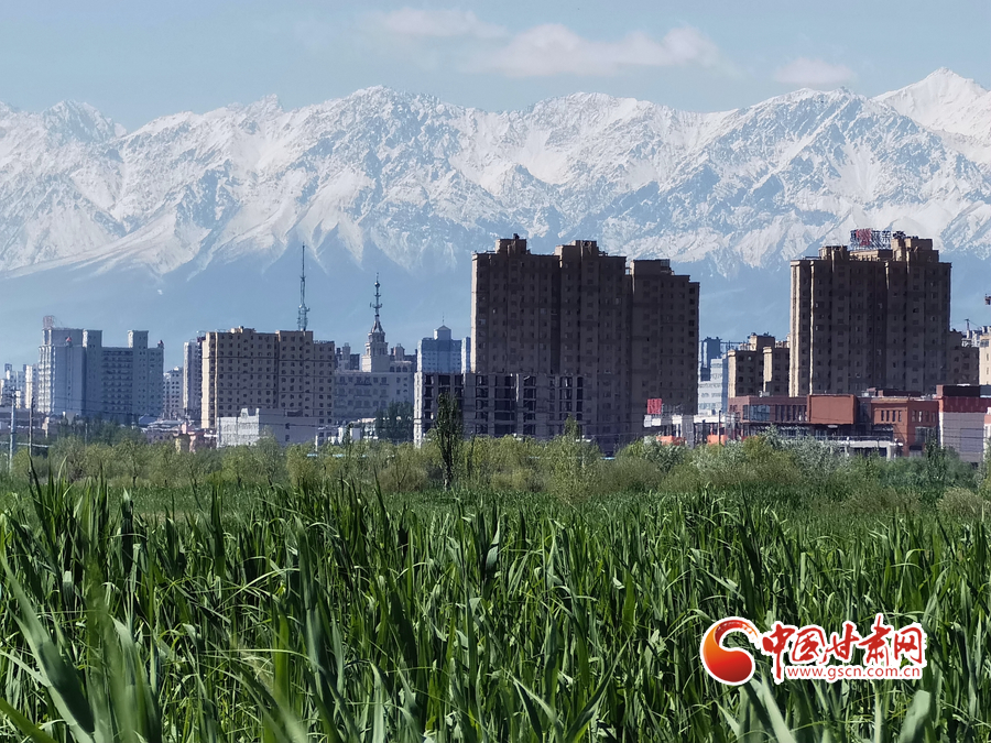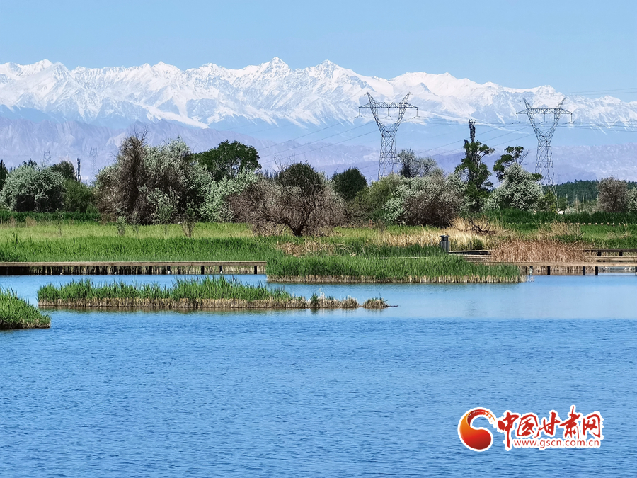 初夏時(shí)節(jié),祁連山下的甘肅省張掖市草木翠綠,湖水蕩漾,在皚皚白雪的映襯下別有一番景色。