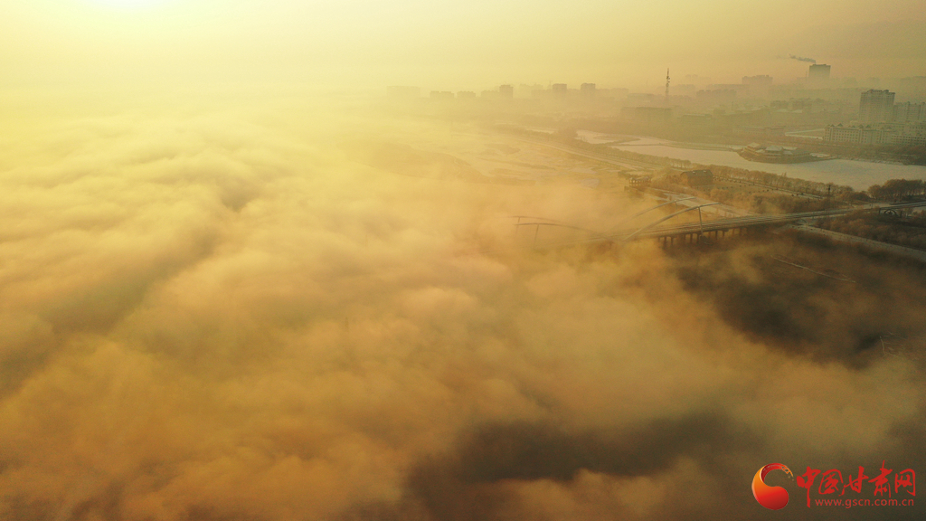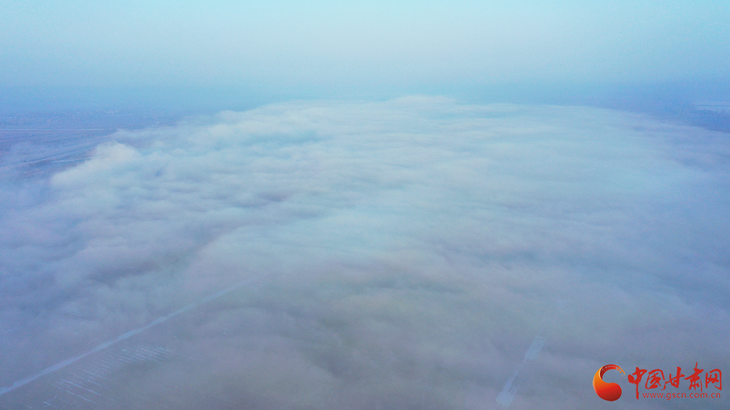 張掖市高臺縣黑河國家城市濕地公園上空的云海景觀。