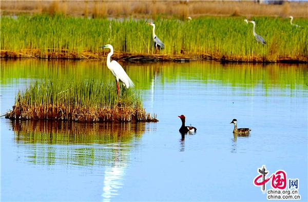 很多鳥(niǎo)類(lèi)對(duì)生存區(qū)域極為挑剔,環(huán)境稍不如意,便會(huì)另覓佳處。這里水質(zhì)清冽,空氣純凈,湖草肥美,魚(yú)食豐盛,正是很多鳥(niǎo)類(lèi)遠(yuǎn)途中的理想家園或行途驛站。據(jù)悉,全球九條候鳥(niǎo)遷徙路線(xiàn)中有三條路過(guò)中國(guó),其中有兩條遷徙路線(xiàn)在寧夏重疊,沙湖以其良好的自然生態(tài)環(huán)境,為眾多候鳥(niǎo)過(guò)境寧夏時(shí)提供了重要棲息繁衍地。