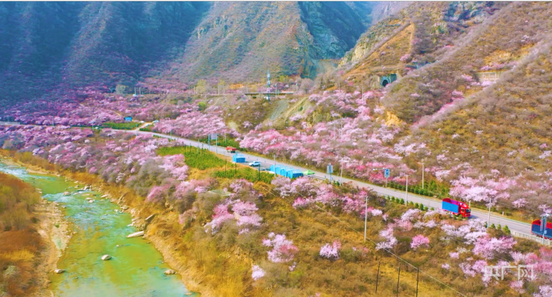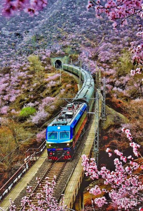 央廣網蘭州4月2日消息 (記者 邸文炯 通訊員 王紅剛 孫淑霞)近日,甘肅省崇信縣峽門寶中鐵路華亭市安口窯站附近的山上桃花盛開,花香四溢、如煙似霞?;疖噺纳街械乃淼来┬卸^,駛向一片春光燦爛。