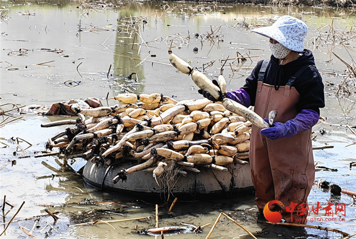 “我們就是東灘村人,在這個養(yǎng)殖場上班,離家近也方便,采藕一年下來能收入2萬多,平時還種地和外出打工,收入挺好的。”李愛芝一邊裝著蓮藕一邊說。