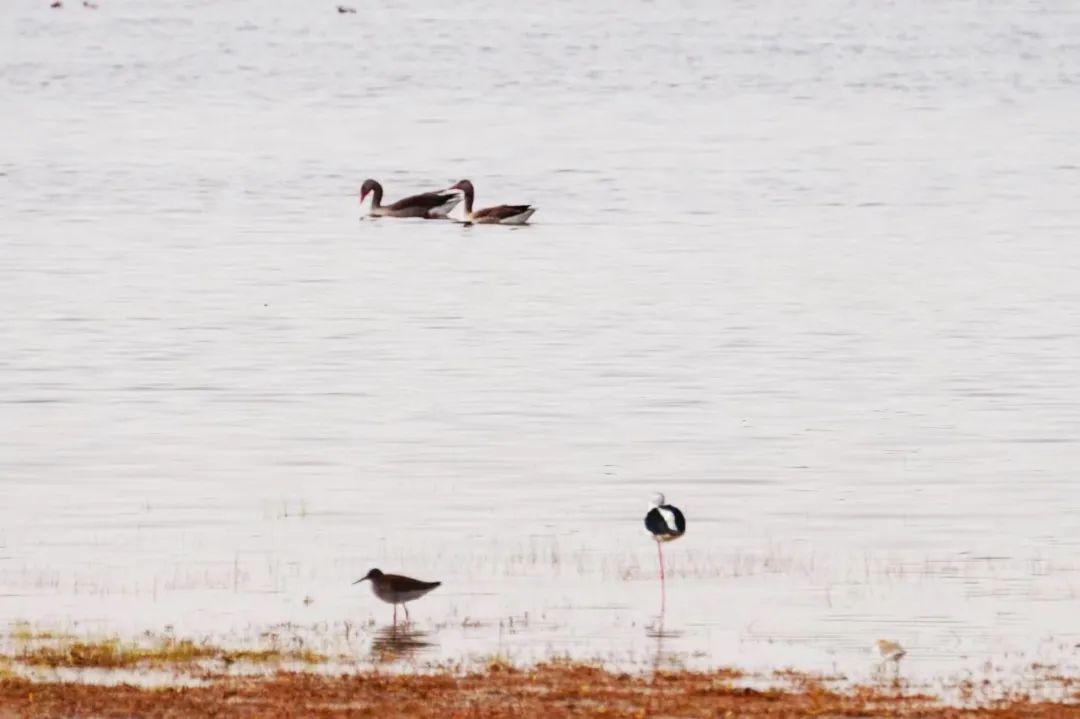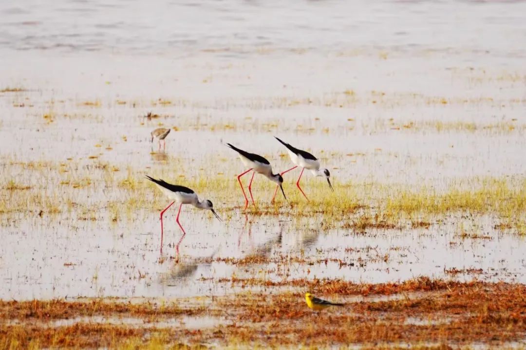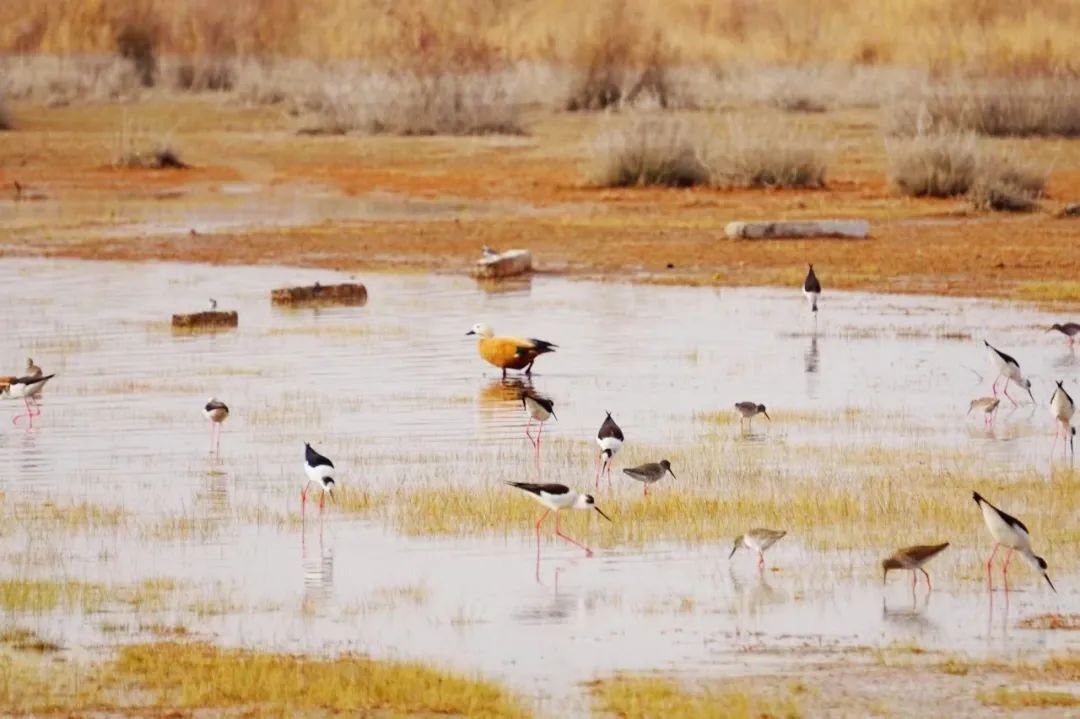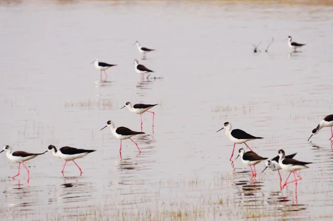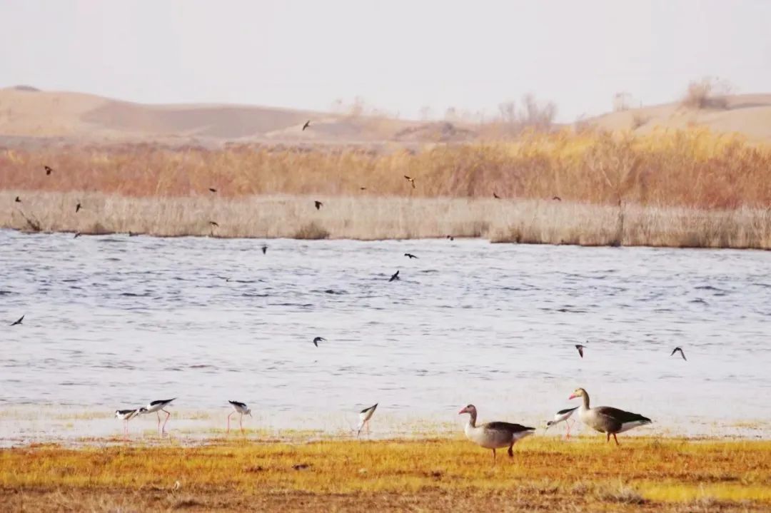 四月的敦煌大地春和景明,在庫姆塔格沙漠的邊緣,位于陽關(guān)濕地的壽昌海子波平如鏡,碧水映襯著祁連山上的雪峰,各種色彩斑斕地鳥兒仿佛收到了春天的邀約,在這里參加一場(chǎng)盛大的聚會(huì)。它們有的在湖面上引頸入水自在覓食,有的踏波翩翩起舞,有的追逐嬉戲鳴唱,有的在岸邊閑庭信步、悠然自得地曬太陽......構(gòu)成了一幅多姿多彩的和諧自然生態(tài)畫卷。
