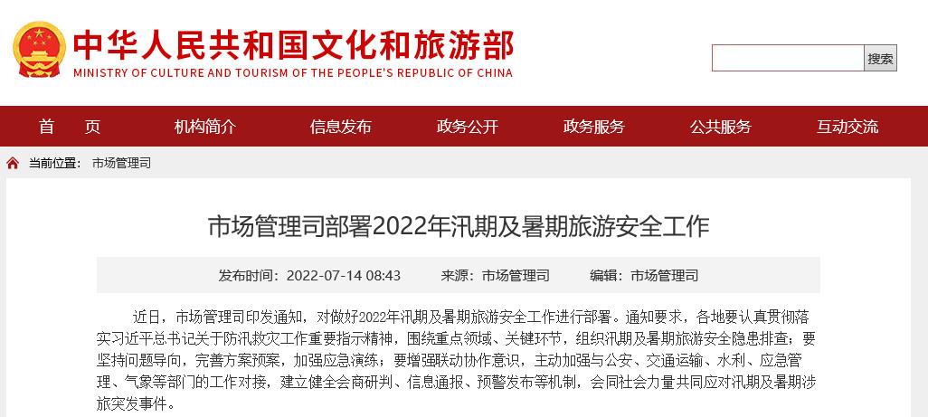 據(jù)文旅部網(wǎng)站消息,近日,文旅部市場(chǎng)管理司印發(fā)通知,對(duì)做好2022年汛期及暑期旅游安全工作進(jìn)行部署。