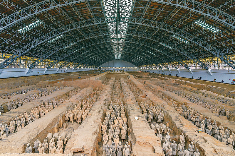秦始皇陵是中國歷史上第一個多民族的中央集權(quán)國家的皇帝秦始皇于公元前246年至公元前208年營建的。作為秦始皇陵陪葬墓坑之一的兵馬俑坑于1974年被發(fā)現(xiàn),被譽為“世界第八大奇跡”。圖為秦始皇兵馬俑博物館一號坑全景?!∪嗣駡D片 丁俊豪/攝