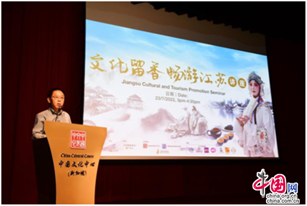 由江蘇省文化和旅游廳主辦、江蘇旅游(新馬)推廣中心協(xié)辦,新加坡中國文化中心、中國駐新加坡旅游辦事處及新加坡江蘇會全力支持的“文化留香·暢游江蘇”講座,于2022年7月23日(星期六)在新加坡中國文化中心4樓劇場舉行。江蘇省文化和旅游廳副廳長李川通過連線參與本次活動,新加坡旅游局助理署長(國際司)陳蕙敏、中國文化中心兼中國駐新加坡旅游辦事處主任肖江華、江蘇省駐新加坡經(jīng)貿(mào)代表處主任代表沈立國,以及來自新加坡文化藝術(shù)界、旅游界、商界、社團(tuán)、新聞媒體及市民大眾等逾200名觀眾現(xiàn)場出席活動。