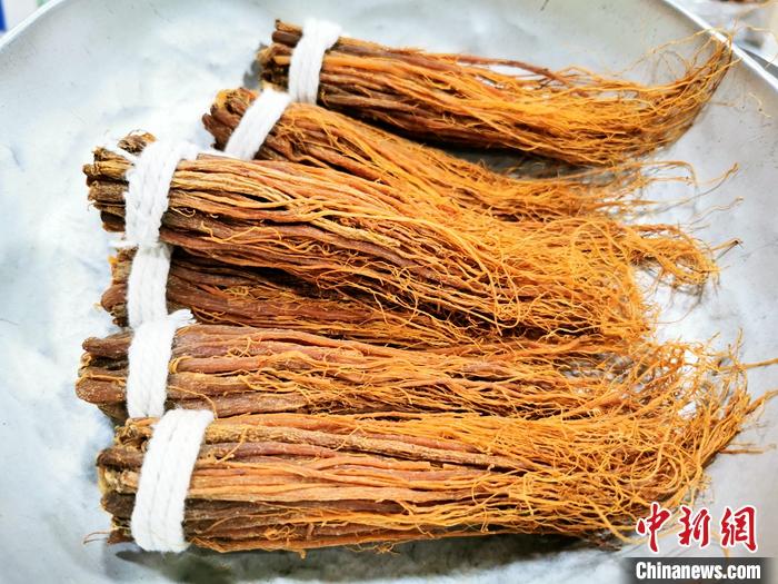 資料圖為用小棉繩捆扎好、按克銷(xiāo)售的參絲。 中新社發(fā) 李曉春 攝