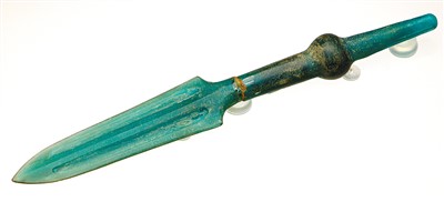 來自湖南博物院的西漢玻璃矛是本次展覽的明星展品之一。玻璃矛為綠色半透明狀,長18.8厘米,刃寬2.2厘米,矛脊兩側(cè)有槽,矛柄作圓柱狀,柄中部凸起成圓球形。這種兵器造型的玻璃制品非常罕見,專家推測其為禮器或明器。這件玻璃矛是本土工匠在吸收地中海玻璃制造技術(shù)的基礎(chǔ)上制作而成,反映了西漢玻璃工藝的高超水平,是研究玻璃文化傳播的重要實(shí)物資料。