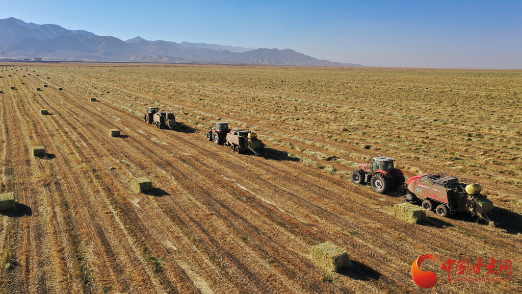 11月9日,甘肅山丹馬場(chǎng)正在對(duì)此前收割晾曬的21萬(wàn)畝燕麥草打包運(yùn)輸,一輛輛大型農(nóng)用機(jī)械穿梭田間忙碌作業(yè)。