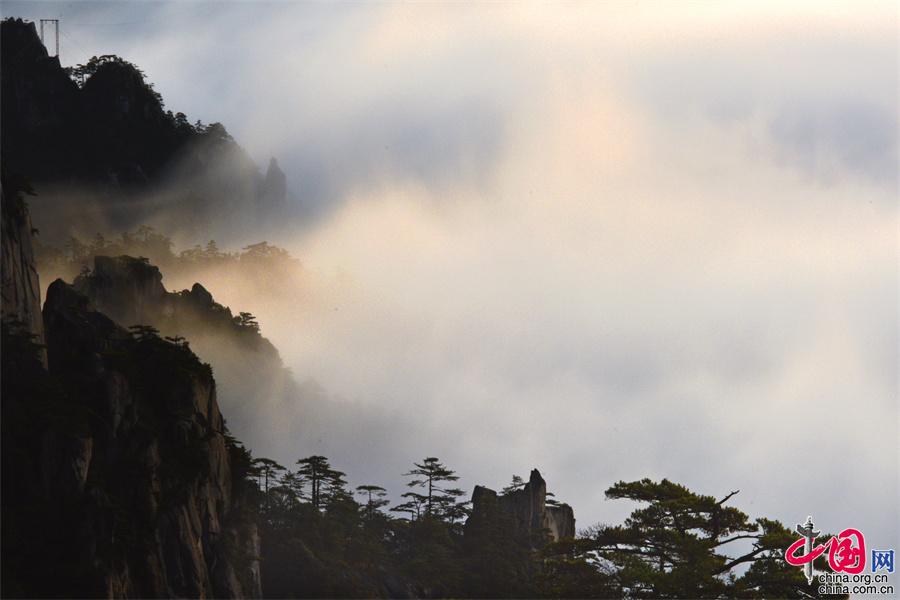 在黃山風景區(qū)的始信峰,群峰中時而云海翻騰,時而霧靄朦朧,時而艷陽高照,還出現(xiàn)了佛光奇觀,勾勒出一幅幅黃山獨有的勝景。