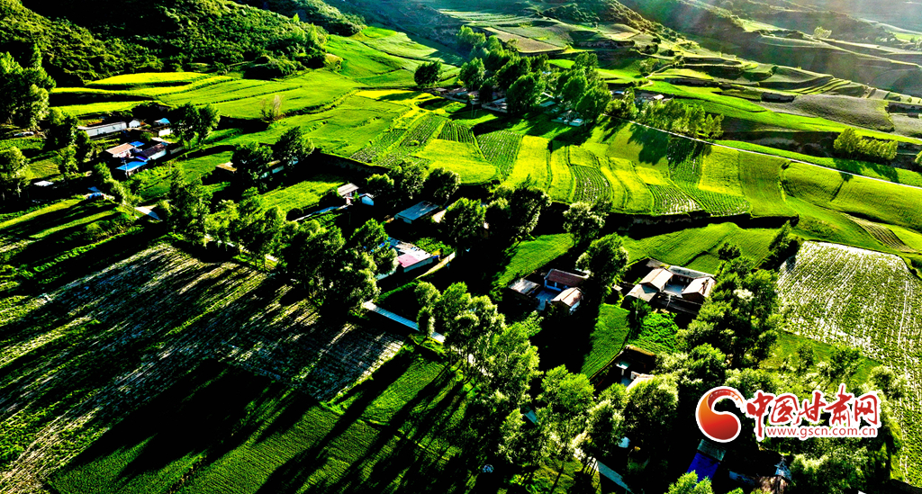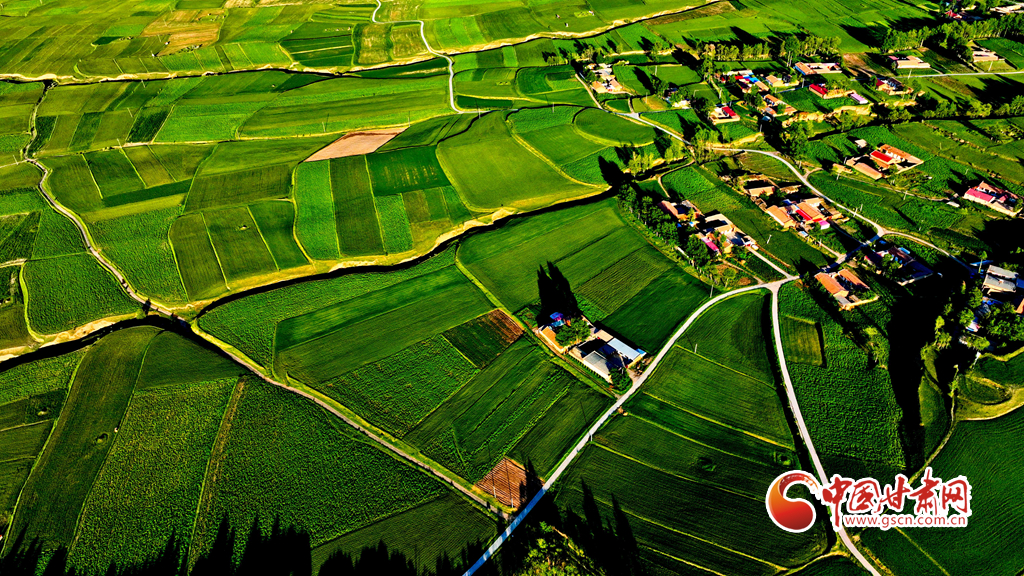 夕陽映襯下的祁連山北民樂縣豐樂鎮(zhèn)易家灣村,綠油油的莊稼生長(zhǎng)旺盛,林木蓊郁層林盡翠,呈現(xiàn)出生機(jī)勃勃的景象,猶如“巨幅綠毯”。