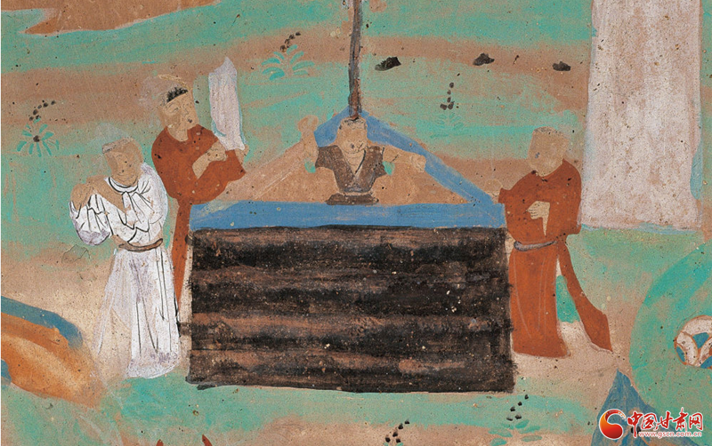 在宋代第55窟東壁門南側(cè)的金光明經(jīng)變右側(cè),有一幅壁畫(huà),從上到下,將一個(gè)“流水長(zhǎng)者子救魚(yú)”故事娓娓道來(lái)。