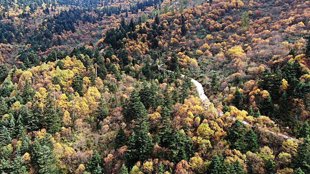 金秋時(shí)節(jié),甘肅省隴南市宕昌縣官鵝溝森林公園層林盡染,斑斕如畫,吸引了不少游客前來游玩。新華網(wǎng)發(fā)(劉輝 攝)