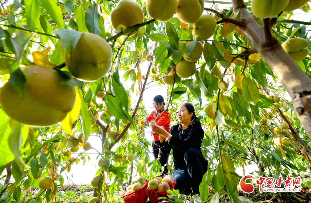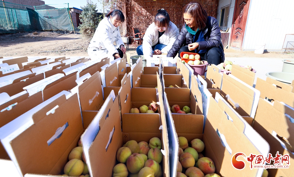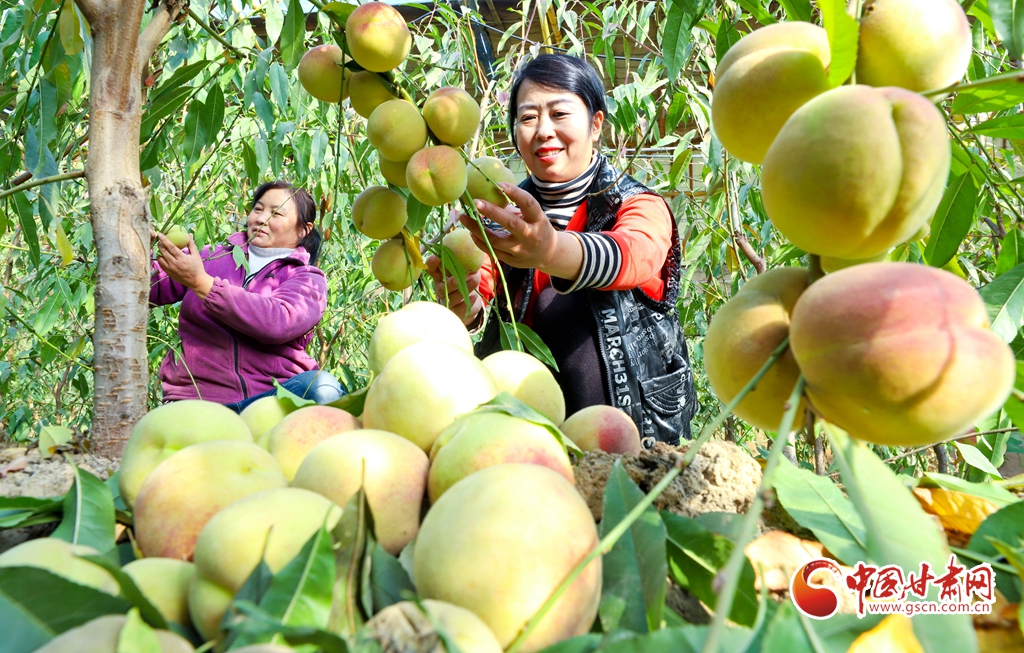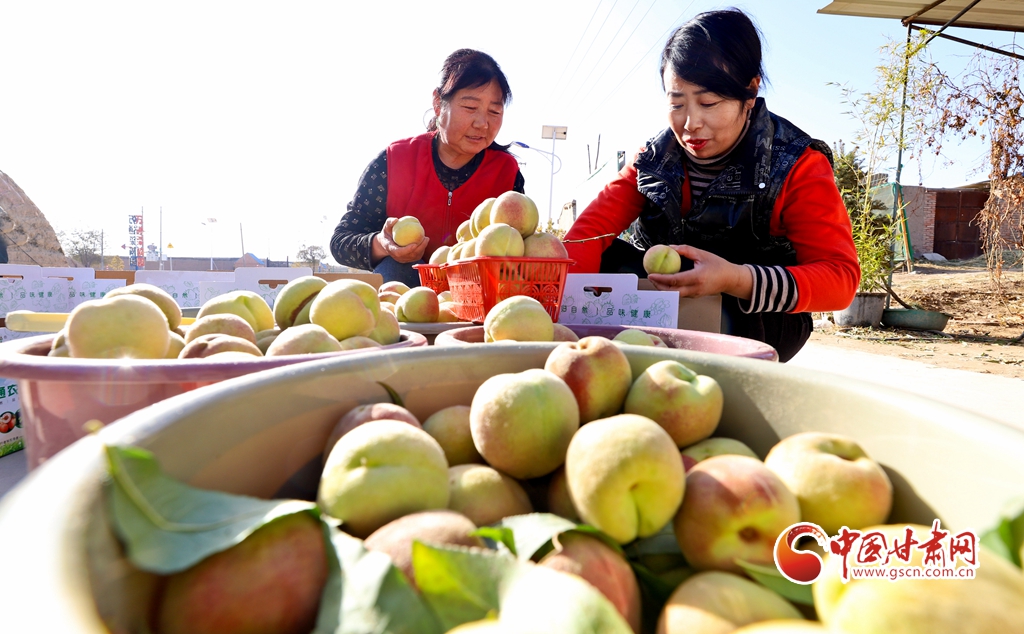 11月13日,甘肅省張掖市甘州區(qū)長安鎮(zhèn)一果蔬種植專業(yè)合作社“甘泉雪桃”種植基地大棚內(nèi),種植農(nóng)戶正在采摘成熟的“甘泉雪桃”。
