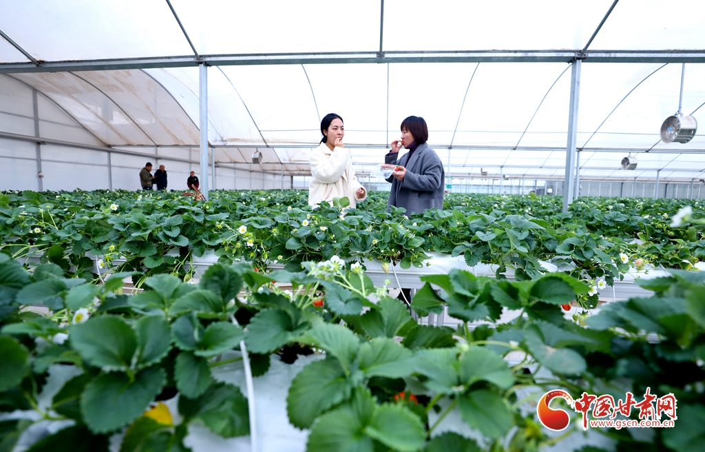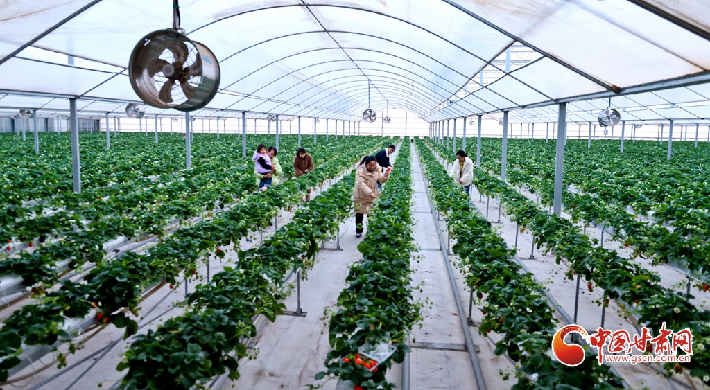 1月15日,甘肅省張掖市甘州區(qū)靖安鄉(xiāng)一草莓種植大棚內(nèi),游客正帶著小朋友采摘草莓。