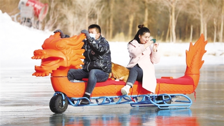游客在金塔沙漠胡楊林冰雪嘉年華項(xiàng)目娛樂(lè)區(qū)游玩。魏 丹 攝