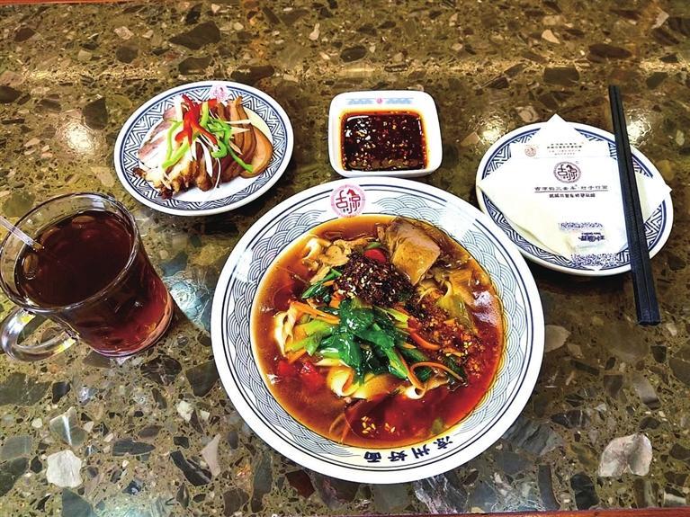 涼州,不僅有悠久的歷史、燦爛的文化,而且有回味無窮的美食。每天中午時分,位于雷臺綜合體的古凉韻“三套車”店里,食客絡(luò)繹不絕。從北京遠(yuǎn)道而來的程先生一行四人,特地前來打卡武威的這道特色美食。一碗行面、一盤鹵肉、一杯茯茶的組合,讓他們吃得津津有味。