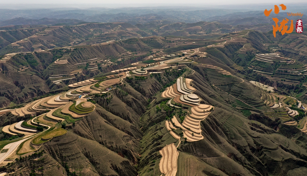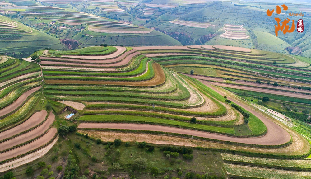 從高空俯瞰下去,在廣袤的大地上,丘陵被開辟成了一層又一層的梯田,金黃的麥浪和嫩綠的秧苗鋪滿田間。