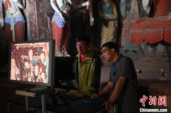 6月5日,敦煌莫高窟內(nèi),敦煌研究院文物數(shù)字化研究所工作人員進(jìn)行敦煌壁畫數(shù)字化圖像現(xiàn)場檢查工作。中新社記者 李亞龍 攝