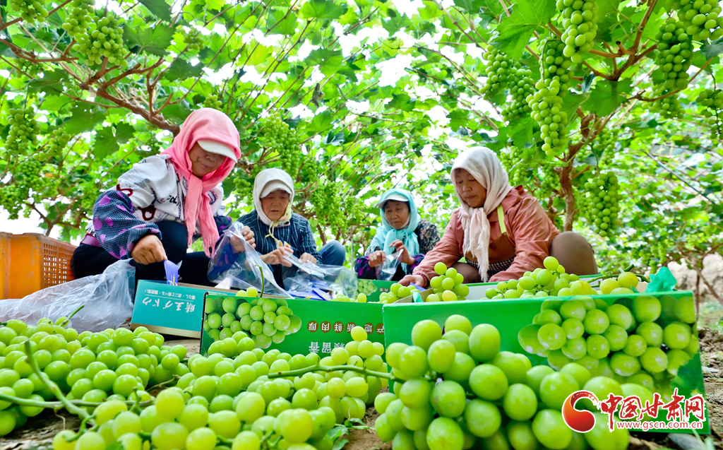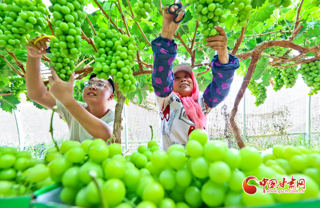 8月28日,在高臺(tái)縣南華鎮(zhèn)智號(hào)村1000畝陽(yáng)光玫瑰葡萄綠色標(biāo)準(zhǔn)化產(chǎn)業(yè)園內(nèi),40多萬(wàn)斤陽(yáng)光玫瑰進(jìn)入成熟采摘期,果農(nóng)們正在采摘、分揀、裝箱,準(zhǔn)備發(fā)往浙江、江蘇、新疆、青海、內(nèi)蒙古等地客商的手中。
