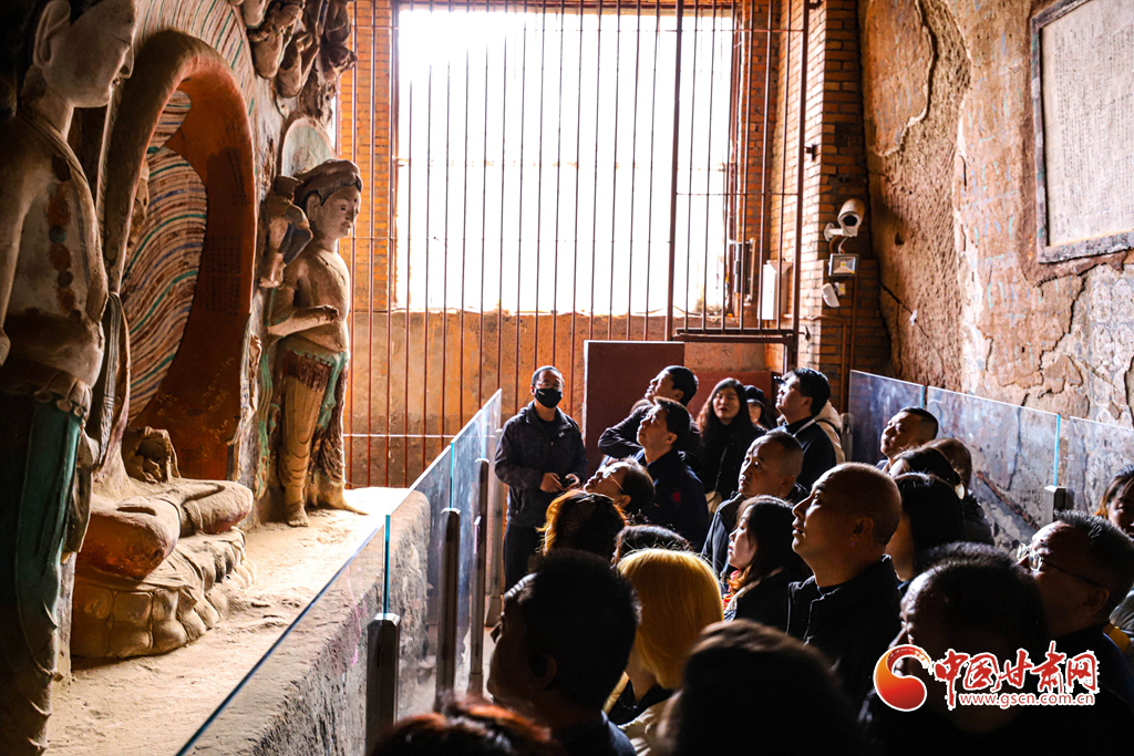 11月9日,甘肅省張掖市肅南裕固族自治縣馬蹄生態(tài)文化旅游景區(qū)金塔寺石窟內,甘肅百家旅行社的導游們正在仔細觀賞千年石窟。