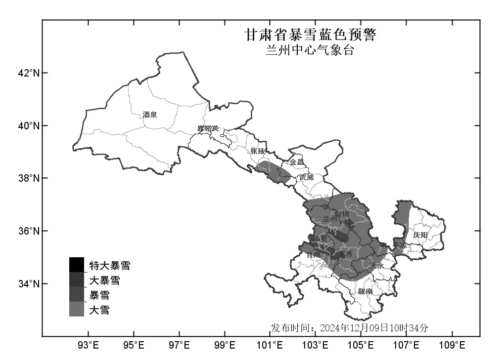 中國甘肅網(wǎng)12月9日訊(西北角·中國甘肅網(wǎng)記者 沈文剛)12月9日10時34分,蘭州中心氣象臺發(fā)布暴雪藍(lán)色預(yù)警,預(yù)計9日15時至10日20時,蘭州、白銀、定西、臨夏等市州及甘南北部、天水西部、平?jīng)鑫鞑?、慶陽西部、張掖南部、武威南部將出現(xiàn)大雪;臨夏南部、定西西部、蘭州南部、白銀中部將出現(xiàn)暴雪。