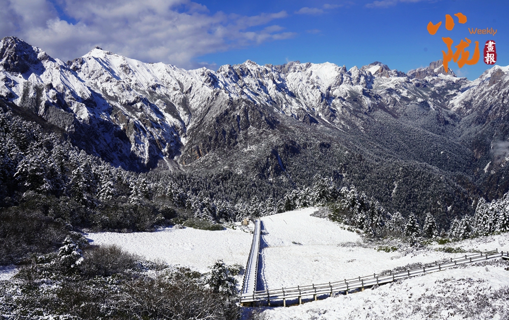 積雪如同軟綿綿的地毯鋪滿(mǎn)了整個(gè)官鵝溝,陽(yáng)光透過(guò)云層照射在這片被雪覆蓋的世界,閃爍著溫柔的光芒。