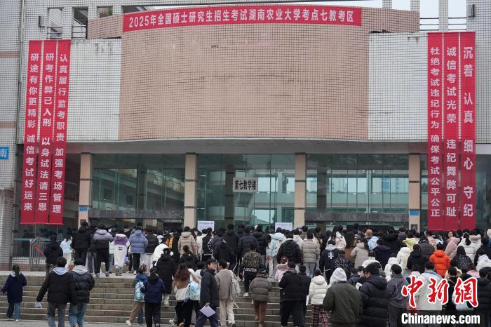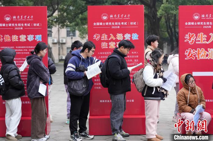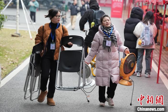 12月21日,2025年全國碩士研究生招生考試初試開考,眾多考生來到湖南農(nóng)業(yè)大學(xué)考點參考。據(jù)教育部數(shù)據(jù)顯示,2025年全國碩士研究生報名人數(shù)為388萬,相比去年下降50萬人,已是連續(xù)兩年報名人數(shù)下降。圖為志愿者將椅子與取暖設(shè)備送入考場。中新社記者 楊華峰 攝