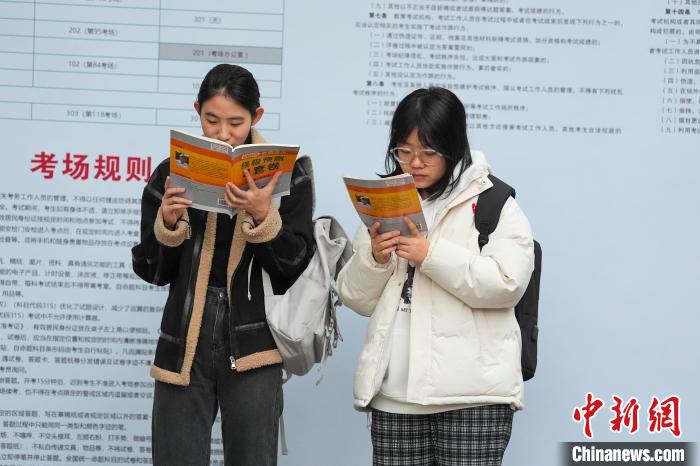 圖為考生在考場外復(fù)習(xí)。中新社記者 楊華峰 攝