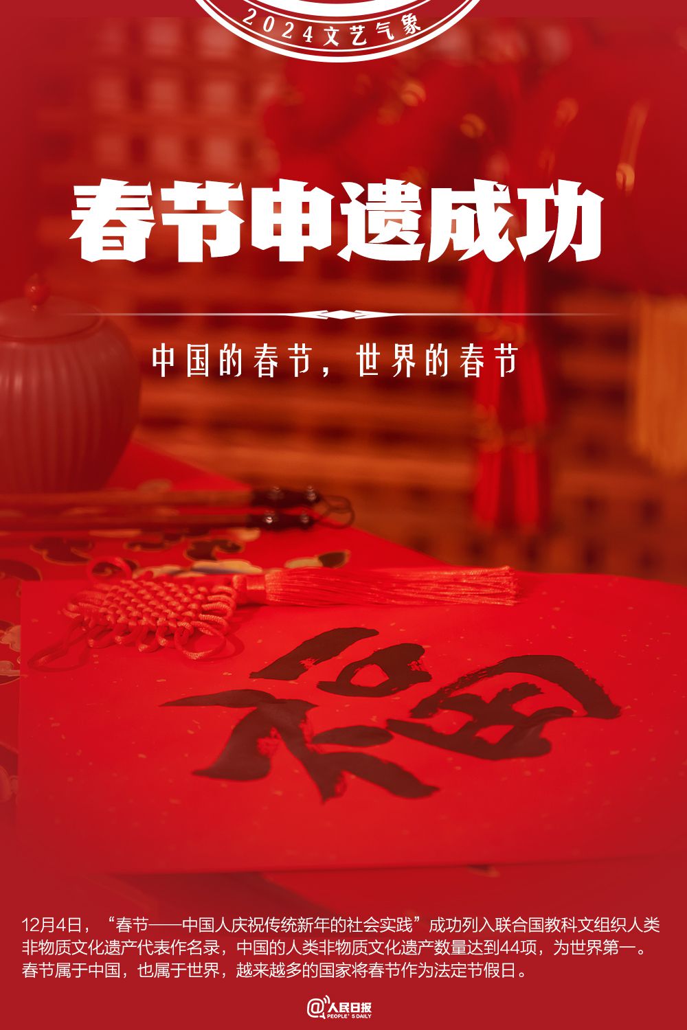 2024年7月27日,“北京中軸線——中國理想都城秩序的杰作”成功列入《世界遺產(chǎn)名錄》,中國世界遺產(chǎn)總數(shù)達(dá)到59項(xiàng)。12月4日,“春節(jié)——中國人慶祝傳統(tǒng)新年的社會(huì)實(shí)踐”成功列入聯(lián)合國教科文組織人類非物質(zhì)文化遺產(chǎn)代表作名錄,至此,中國共有44個(gè)項(xiàng)目列入聯(lián)合國教科文組織非物質(zhì)文化遺產(chǎn)名錄、名冊,總數(shù)居世界第一。