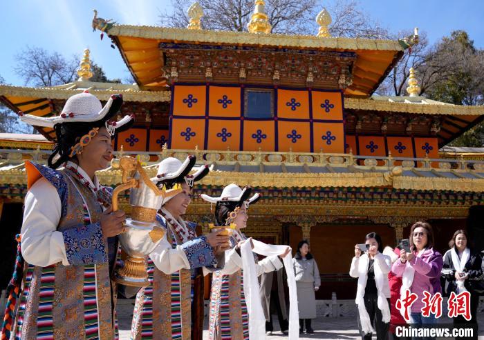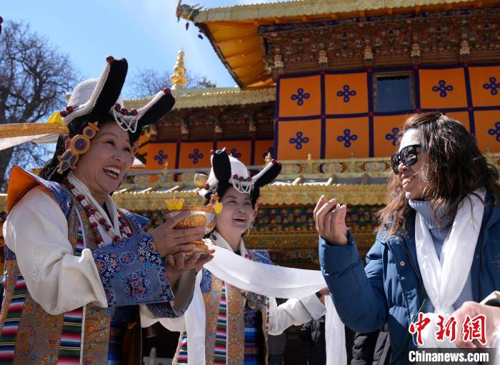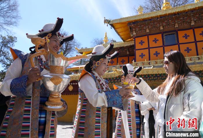 2月20日,由西藏自治區(qū)文化和旅游廳舉辦的2025年香港至拉薩航班首航旅行團歡迎儀式在羅布林卡舉行。來自香港的游客將前往布達拉宮、大昭寺等地,開啟冬游西藏旅途。2月19日,拉薩至香港的首條地區(qū)航線正式開通。航線的開通,更加便捷了兩地居民的出行,也將進一步促進兩地在旅游、文化、經貿等領域的交流與合作。圖為歡迎儀式現(xiàn)場,工作人員向香港游客敬獻青稞酒。中新社記者 李林 攝