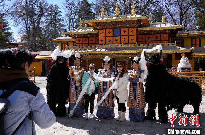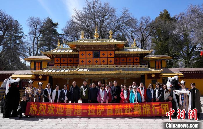 圖為歡迎儀式現(xiàn)場,香港游客在羅布林卡與身著拉薩傳統(tǒng)服飾的工作人員合影留念。中新社記者 李林 攝