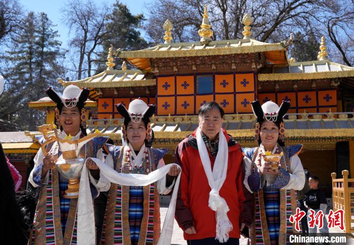 圖為歡迎儀式現(xiàn)場,香港游客在羅布林卡與工作人員合影留念。中新社記者 李林 攝
