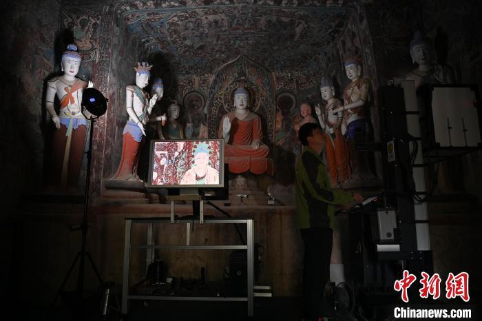 2024年6月5日,甘肅省敦煌市莫高窟內(nèi),敦煌研究院文物數(shù)字化研究所工作人員進(jìn)行敦煌壁畫數(shù)字化采集工作。 中新社記者 李亞龍 攝