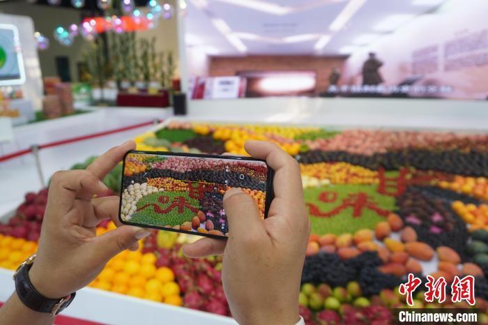 2022年7月10日,第二十八屆中國蘭州投資貿(mào)易洽談會(huì)展區(qū)展示甘肅地方特色產(chǎn)品。圖為參觀者手機(jī)拍攝用農(nóng)產(chǎn)品拼裝的“甘味”。(資料圖)九美旦增 攝