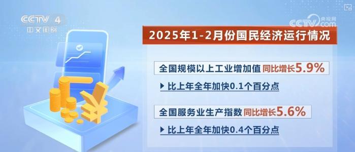 數(shù)據(jù)顯示,2025年1—2月份,工業(yè)生產(chǎn)較快增長,全國規(guī)模以上工業(yè)增加值同比增長5.9%,比上年全年加快0.1個(gè)百分點(diǎn)。服務(wù)業(yè)增勢(shì)較好,全國服務(wù)業(yè)生產(chǎn)指數(shù)同比增長5.6%,比上年全年加快0.4個(gè)百分點(diǎn)。市場(chǎng)銷售增長加快,社會(huì)消費(fèi)品零售總額83731億元,同比增長4.0%,比上年全年加快0.5個(gè)百分點(diǎn)。