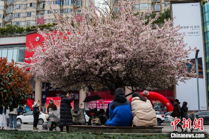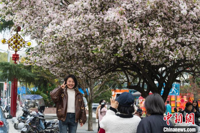 圖為3月16日,棠湖公園正大門處,垂絲海棠盛開,市民在此拍照打卡。韓金雨 攝