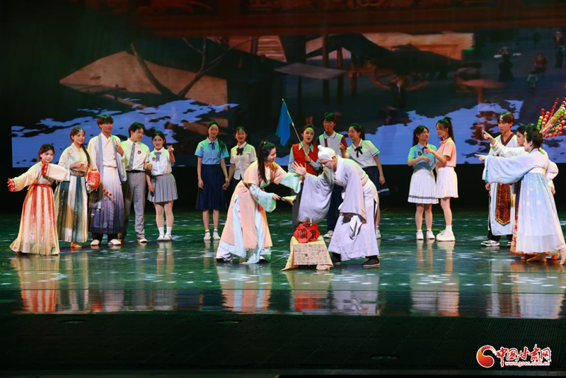 詩(shī)會(huì)以涼州詞為核心意象,主體分為“涼州·思”“涼州·行”“涼州·吟”“涼州·樂(lè)”四個(gè)篇章,各有側(cè)重又層層遞進(jìn),全方位展現(xiàn)涼州文化的多元魅力。第一篇章“涼州·思”以《天馬歌》的朗誦、《邊塞詩(shī)情》的情景劇與《鼓韻風(fēng)華》的表演,共同勾勒天馬傳奇與戍邊情懷,展現(xiàn)涼州深沉雄健的文化基因;第二篇章“涼州·行”借助AI主持與情景演繹,串聯(lián)起情景劇《跟著詩(shī)詞游武威》,以科技+文旅的視角,帶領(lǐng)觀眾開(kāi)啟了一場(chǎng)沉浸式漫游;第三篇“涼州·吟”以《西涼樂(lè)舞》、音詩(shī)畫(huà)《涼州詞》等多元舞臺(tái)形式吟誦涼州詞章的雋永風(fēng)流,對(duì)誦表演《古涼新韻》,以“古今對(duì)話”解鎖涼州文化密碼,誦讀者交替誦讀“舊八景”與“新八景”組詩(shī),從《大云晚鐘》《黃羊秋牧》等古景詩(shī),到《河西都會(huì)》《摘星小鎮(zhèn)》等新景作,舞臺(tái)上“聲、形、畫(huà)、墨”交織,盡顯涼州古今風(fēng)貌,引得觀眾沉醉鼓掌;第四篇“涼州·樂(lè)”情景再現(xiàn)了《涼州夜宴》,品味葡萄美酒中的絲路情韻;尾聲“詩(shī)意涼州·藝游武威”,全場(chǎng)共同唱響對(duì)涼州的禮贊,并以“等你在涼州”發(fā)出誠(chéng)摯邀約,讓千年涼州的詩(shī)意與魅力,在新時(shí)代持續(xù)綻放光彩。
