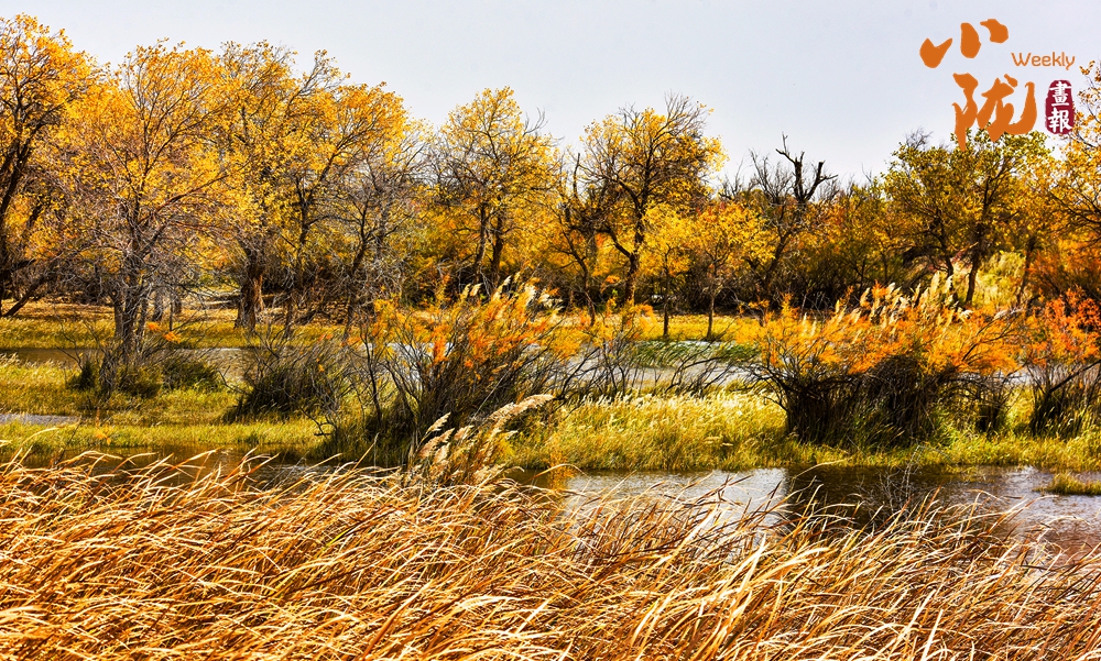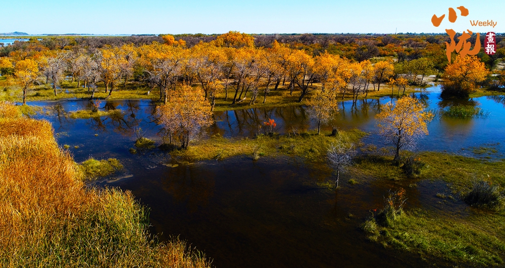 金色胡楊在陽光下泛著溫暖光澤,斑斕絢麗的蘆葦如金色絲帶點綴荒漠,與碧綠河水、湛藍天空構成濃墨重彩的秋日圖景。