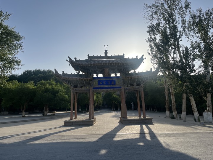 大牌坊是莫高窟另一處標(biāo)志性景觀。要進(jìn)入莫高窟窟區(qū),首先得經(jīng)過這座莊重質(zhì)樸、飛檐翹角的牌坊。牌坊匾額東面是“石室寶藏”,西面是“三危攬勝”,夕陽西下時,更顯古韻。