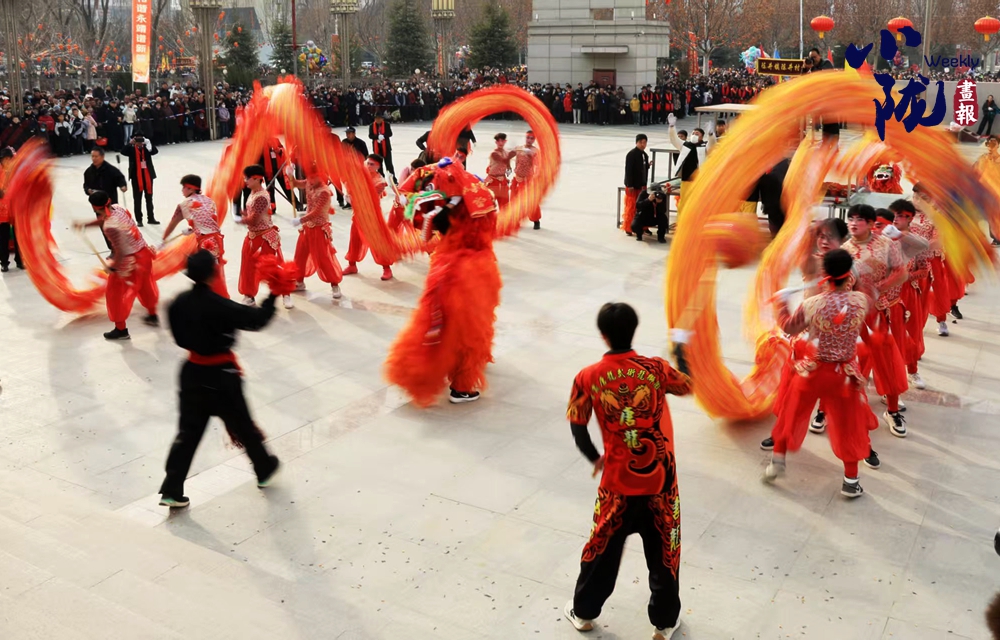 兩條金龍翻江倒海,踏著鼓點(diǎn)蜿蜒游走。舞龍的小伙子們步伐矯健,巨龍?jiān)谒麄兊氖种袝r(shí)而盤旋昂首,時(shí)而穿梭遨游,龍身隨著龍珠上下起伏,氣勢(shì)雄武遒勁。