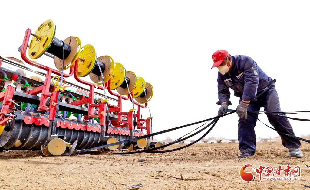 3月12日,張掖市高臺縣巷道鎮(zhèn)殷家橋村綠色高效小麥種植基地上,農(nóng)戶們在播種中進(jìn)行滴灌帶的接續(xù)。