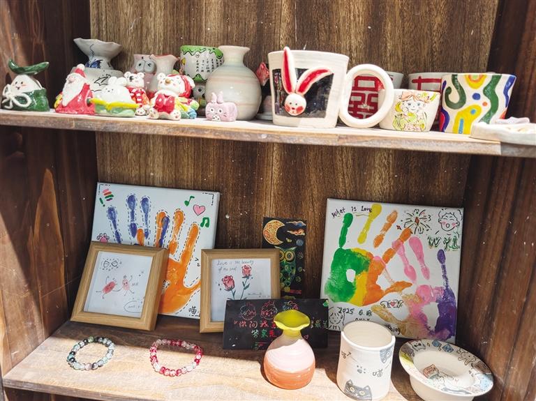 貨架上,各類(lèi)手工成品整齊擺放:色彩豐富的拼豆掛件、簡(jiǎn)約精致的銀戒指、溫潤(rùn)質(zhì)樸的陶土杯、造型可愛(ài)的石膏玩偶,每一件都帶著手工獨(dú)有的溫度。